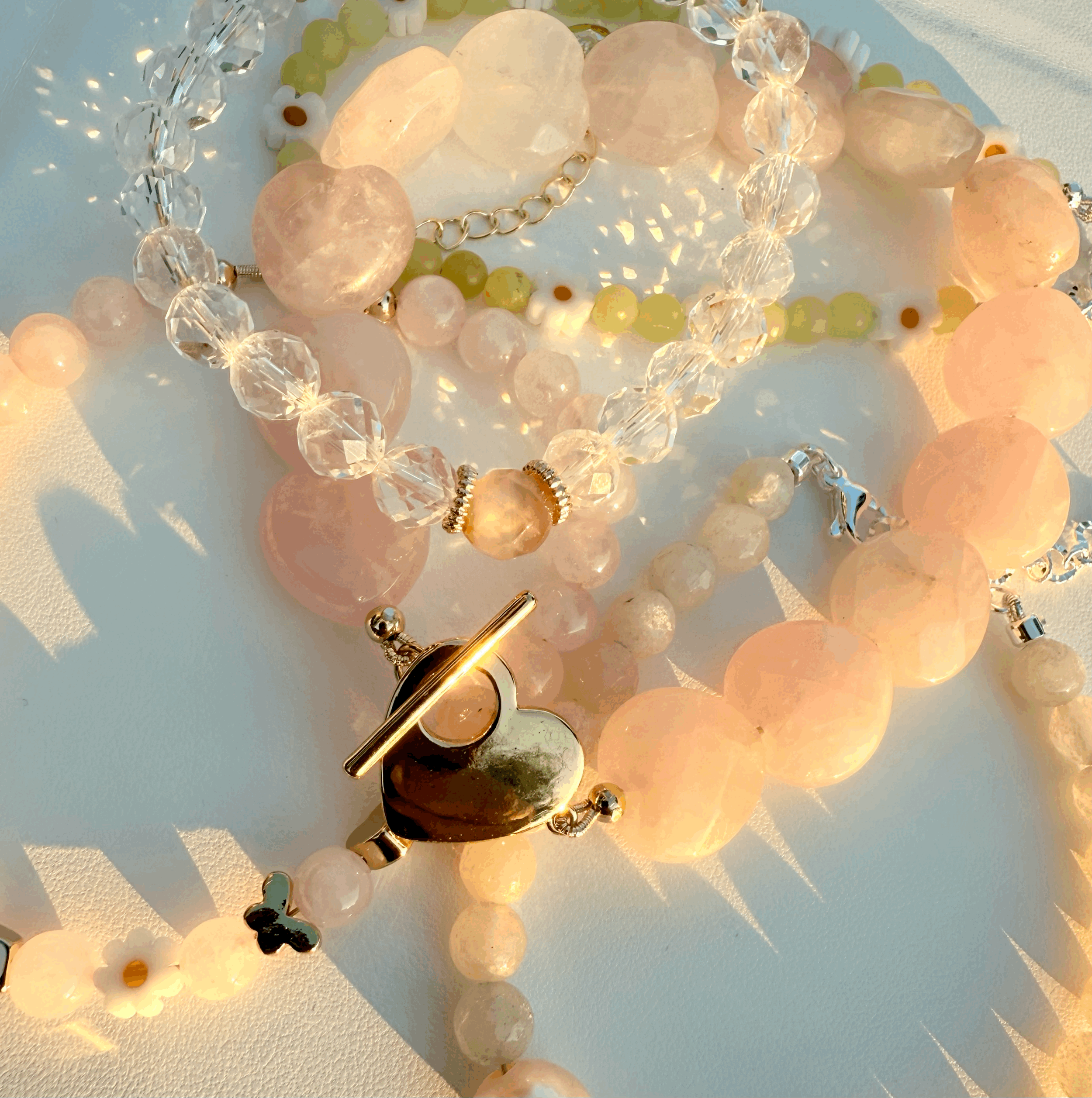 • Heart Chakra (Green/Pink) → Love & healing → Rose Quartz, Green Aventurine